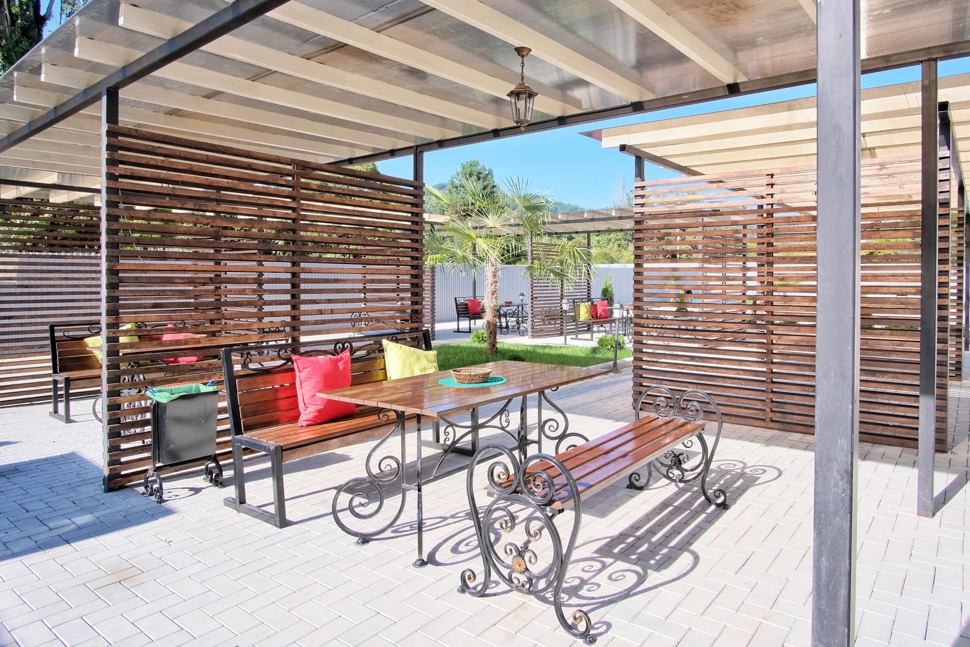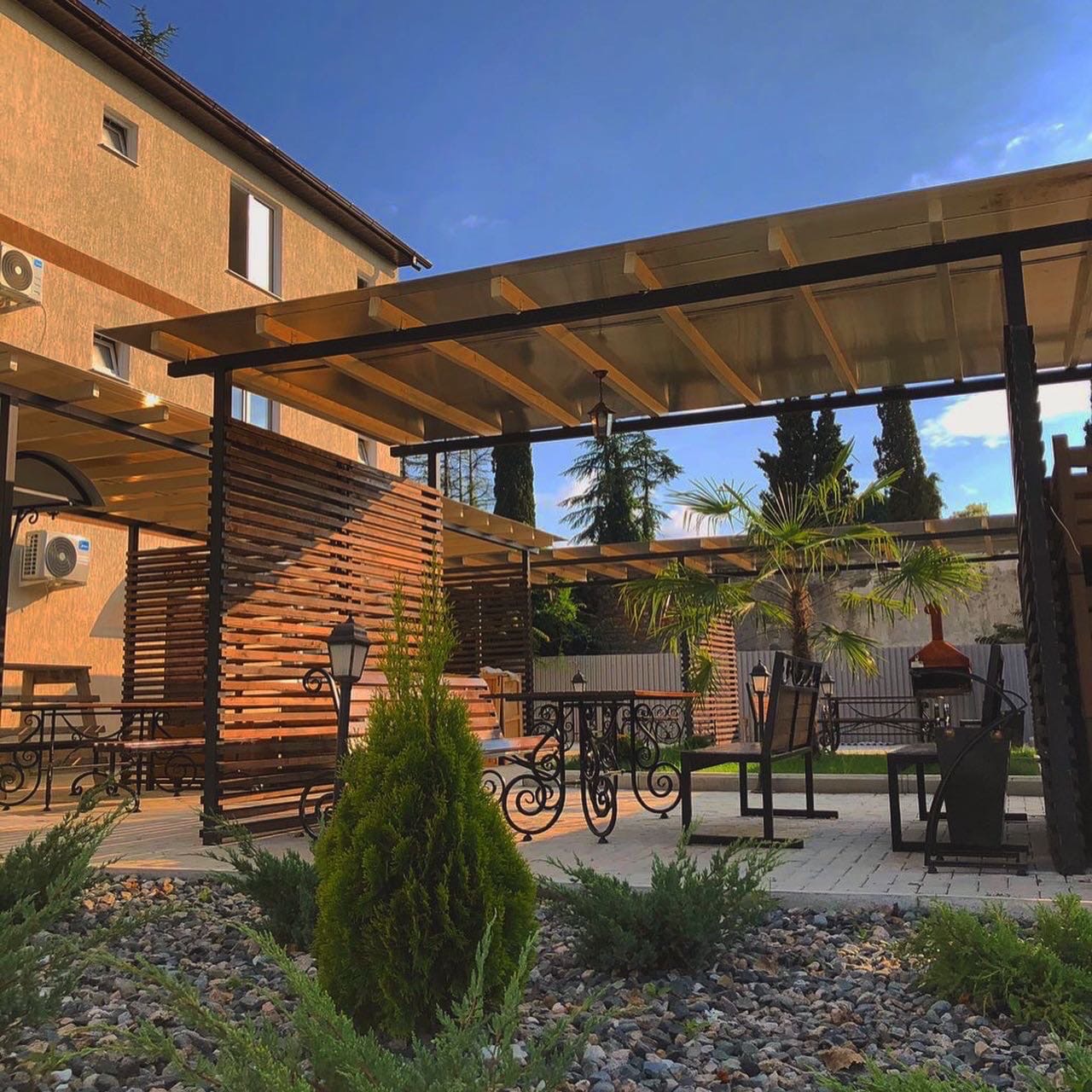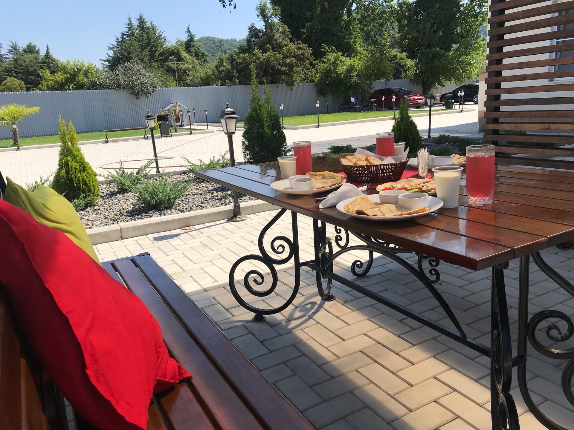 Имеется зона барбекю и мангальная зона, открытый бассейн, беседки на свежем воздухе, детская площадка, можно взять велосипеды напрокат.